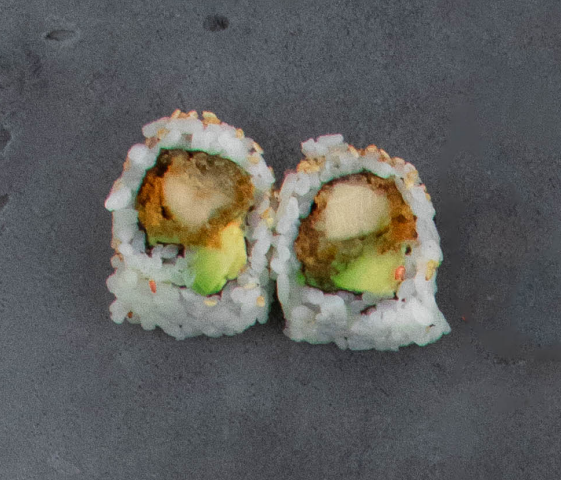 Med dybstegt kylling, avocado, chilimayo og teriyaki. Rullet i sesam.