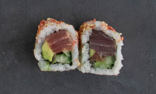 Med tun, avocado, agurk og chilimayo. Rullet i kimchisesam